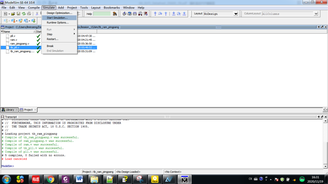 保存后退出,打开modelsim并创建工程,编译通过后,进入仿真步骤,在simulate状态栏下选择start simulate,如下图: