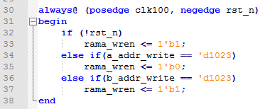 在rama和ramb写使能信号转换时,发现空了一拍,再查看代码,发现rama、ramb写使能在条件判断时,使用的判断逻辑是不一样的,导致ramb_wren的置位会在rama_wren置位后的下一拍进行。