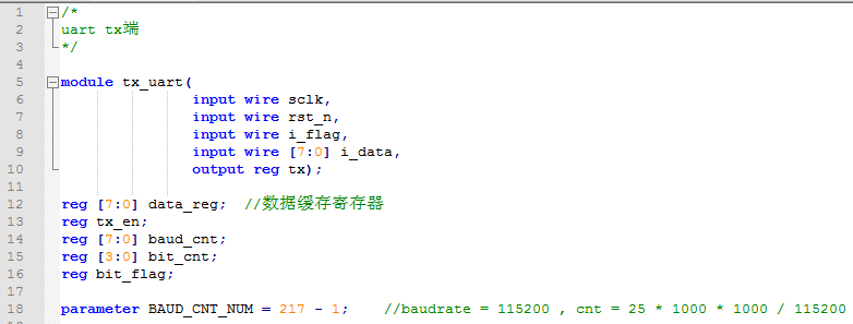 3、波特率计算:uart传输有不同的波特率,使用HDL语言描述时,通常使用计数器来实现不同波特率的数据传播。计数器的计数值与具体波特率有关,以常见的115200为例,假设系统时钟是25Mhz,则传输1bit所需要的时钟周期为25 * 1000 *1000 /115200 = 217个,因此计数器计数值即216(从0开始计数)。