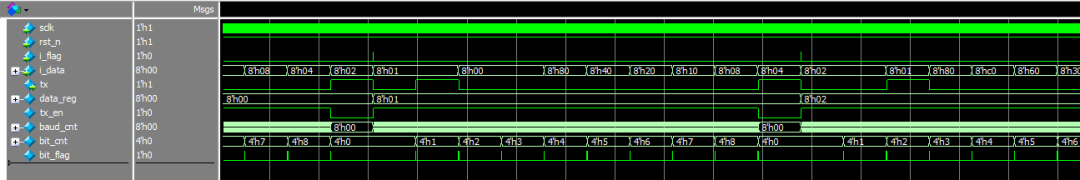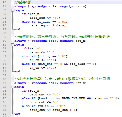 另外,不能使用tx_en == 1'b1作为发送起始位的判断条件,因为tx_en 在数据发送时一直为1,这样tx端会恒为0,修改后代码如下:
