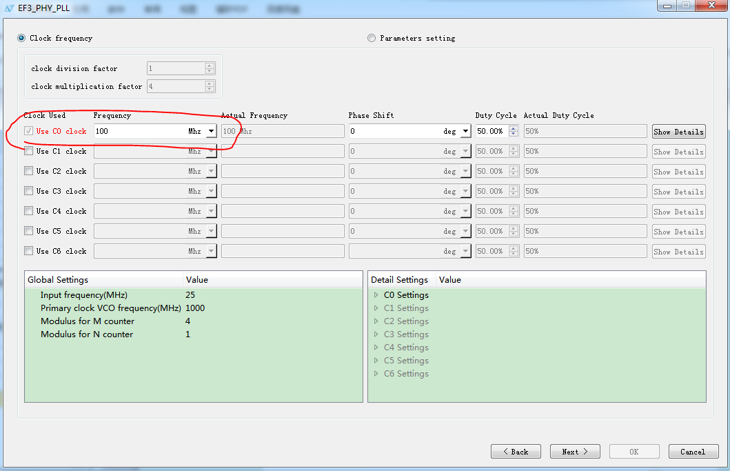输出时钟填入所需要的100Mhz,并从C0输出。