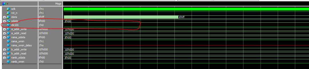 在rama和ramb写使能信号转换时,发现空了一拍,再查看代码,发现rama、ramb写使能在条件判断时,使用的判断逻辑是不一样的,导致ramb_wren的置位会在rama_wren置位后的下一拍进行。