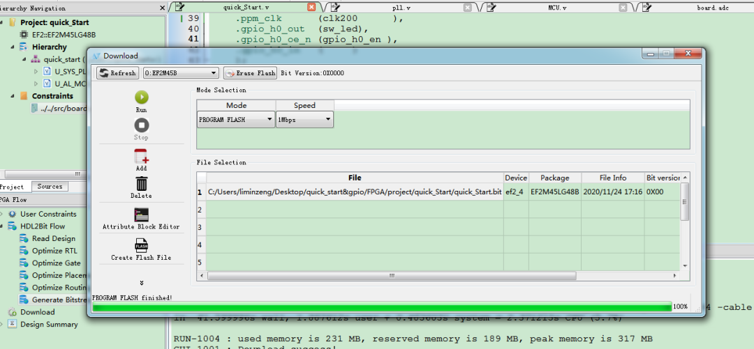 保存后,双击generate bitstream编译TD工程,假如在选择路径前已经编译过TD工程了,需要右键选择rerun重新编译(注意:假如修改了keil的C文件而TD的HDL文件没有变化,建议也rerun后再将文件下载至开发板)