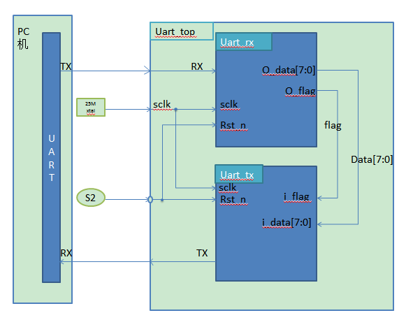 rx,接收端,位宽为 1 比特, pc 机通过串口往 FPGA 发 8 比特数据时,FPGA 通过串口线 rx 一位一位地接收,从最低位到最高位依次接收,最后在 FPGA 里面位拼接成8 比特数据。