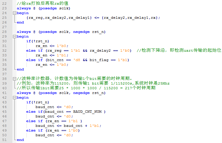 3、波特率计算:uart传输有不同的波特率,使用HDL语言描述时,通常使用计数器来实现不同波特率的数据传播。计数器的计数值与具体波特率有关,以常见的115200为例,假设系统时钟是25Mhz,则传输1bit所需要的时钟周期为25 * 1000 *1000 /115200 = 217个,因此计数器计数值即216(从0开始计数)。