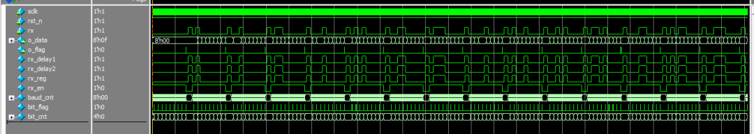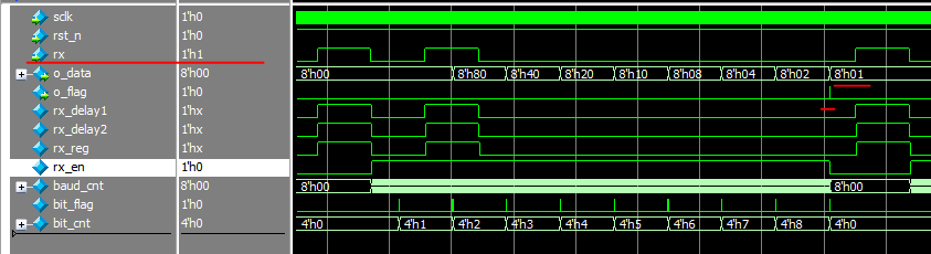 当rx=1时,输出的o_data并行数据在o_flag = 1(即表示传输结束)时也为1,结果正常。