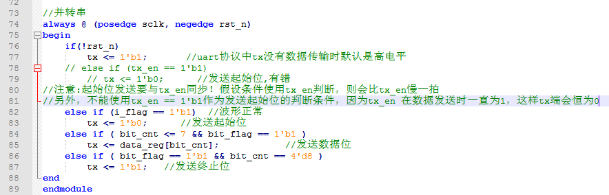 另外,不能使用tx_en == 1'b1作为发送起始位的判断条件,因为tx_en 在数据发送时一直为1,这样tx端会恒为0,修改后代码如下: