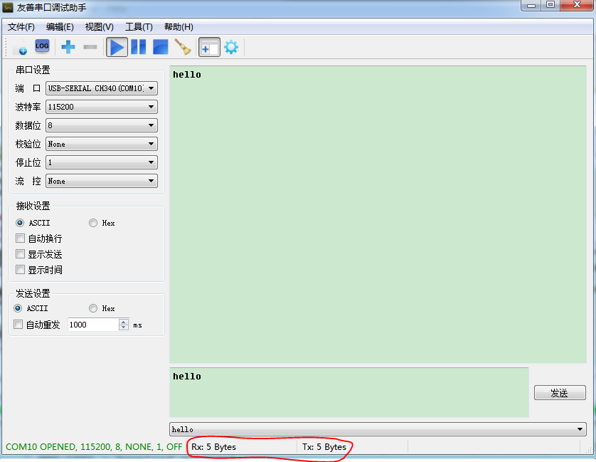 代码下载进开发板后,在串口调试助手中可以正常收发数据,如下: